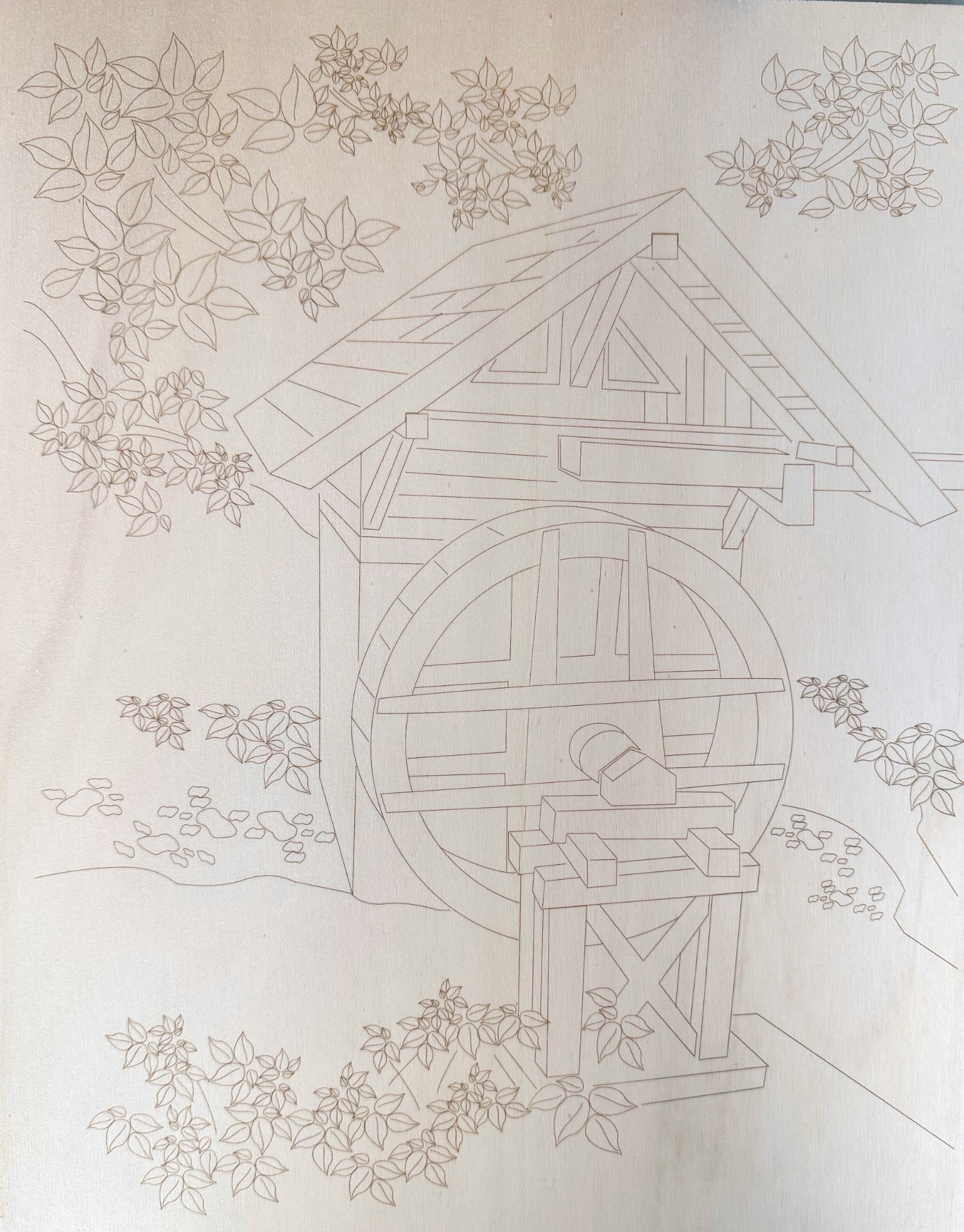 Plošča "Vodni mlin" iz 3 mm debele vezane plošče lesa topole.